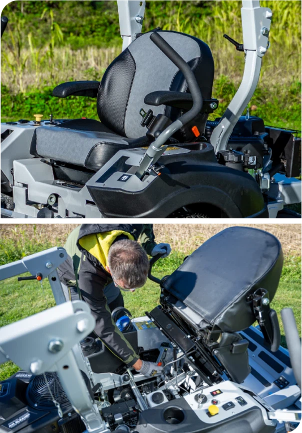 Il sedile ampio, regolabile e dotato di braccioli, è di grande comfort. La posizione di guida risulta naturale grazie anche alla possibilità di regolare in altezza la posizione delle leve di avanzamento. Il sedile è ribaltabile tramite una molla a gas, permette una facile ispezione e manutenzione della macchina. Sotto il sedile troviamo accesso semplice a: